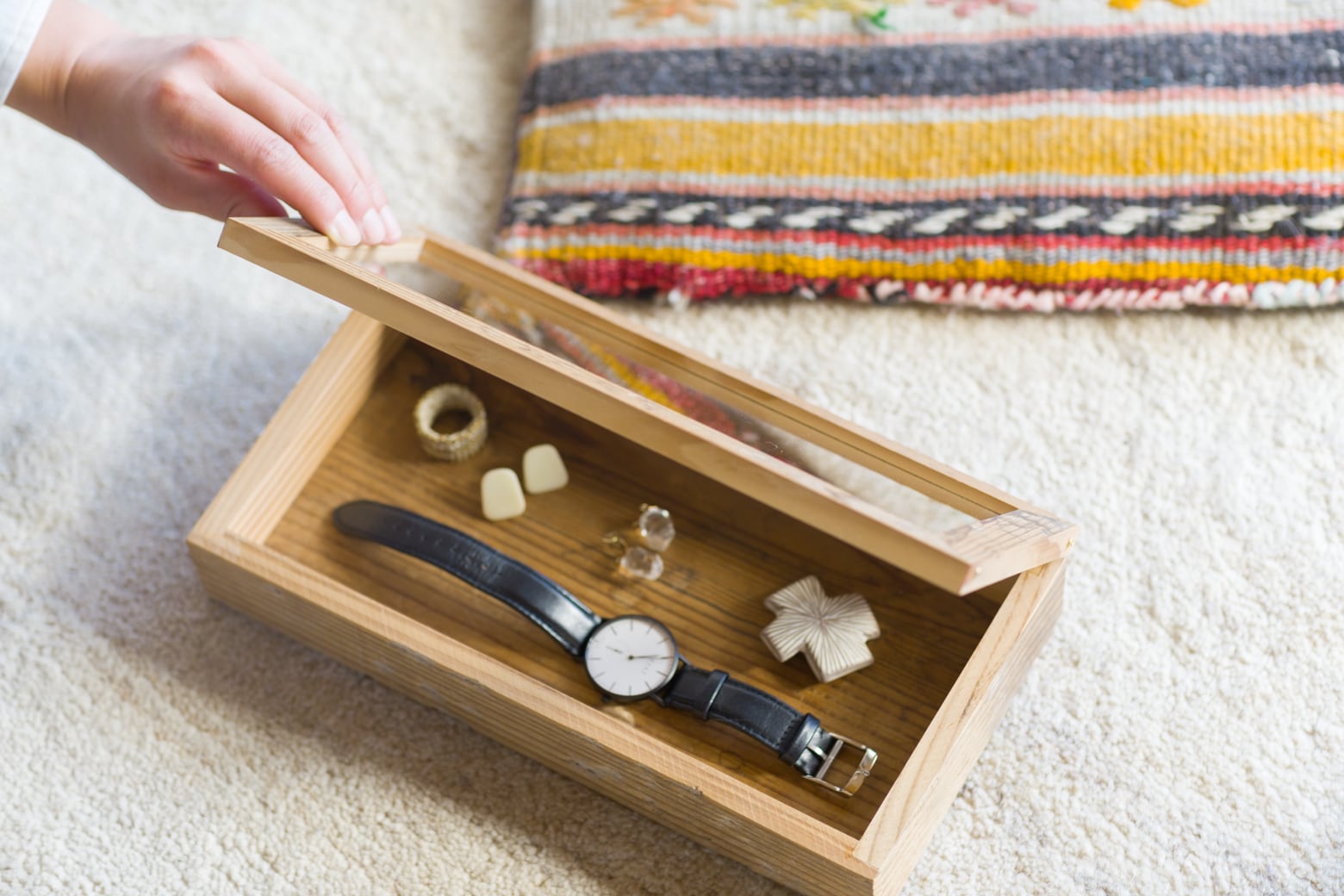 上の部分は蝶番で開閉できるクリアガラスの蓋がついているので、ネックレスなどお気に入りのアクセサリーを入れて見せる収納を楽しめます。