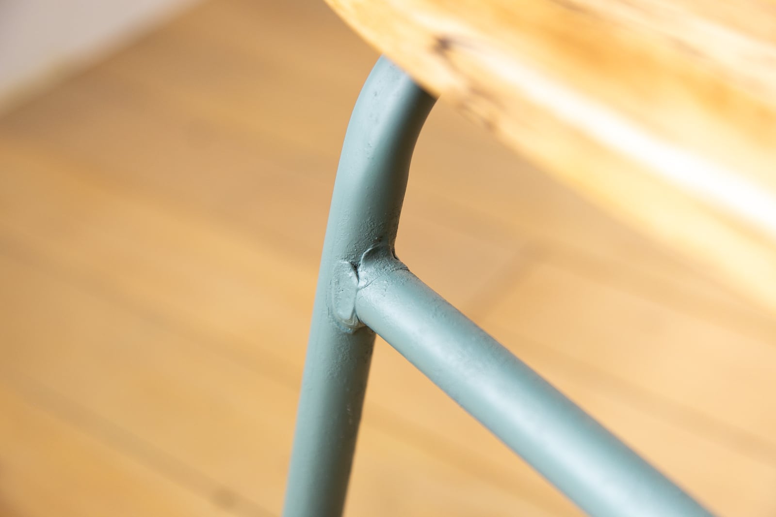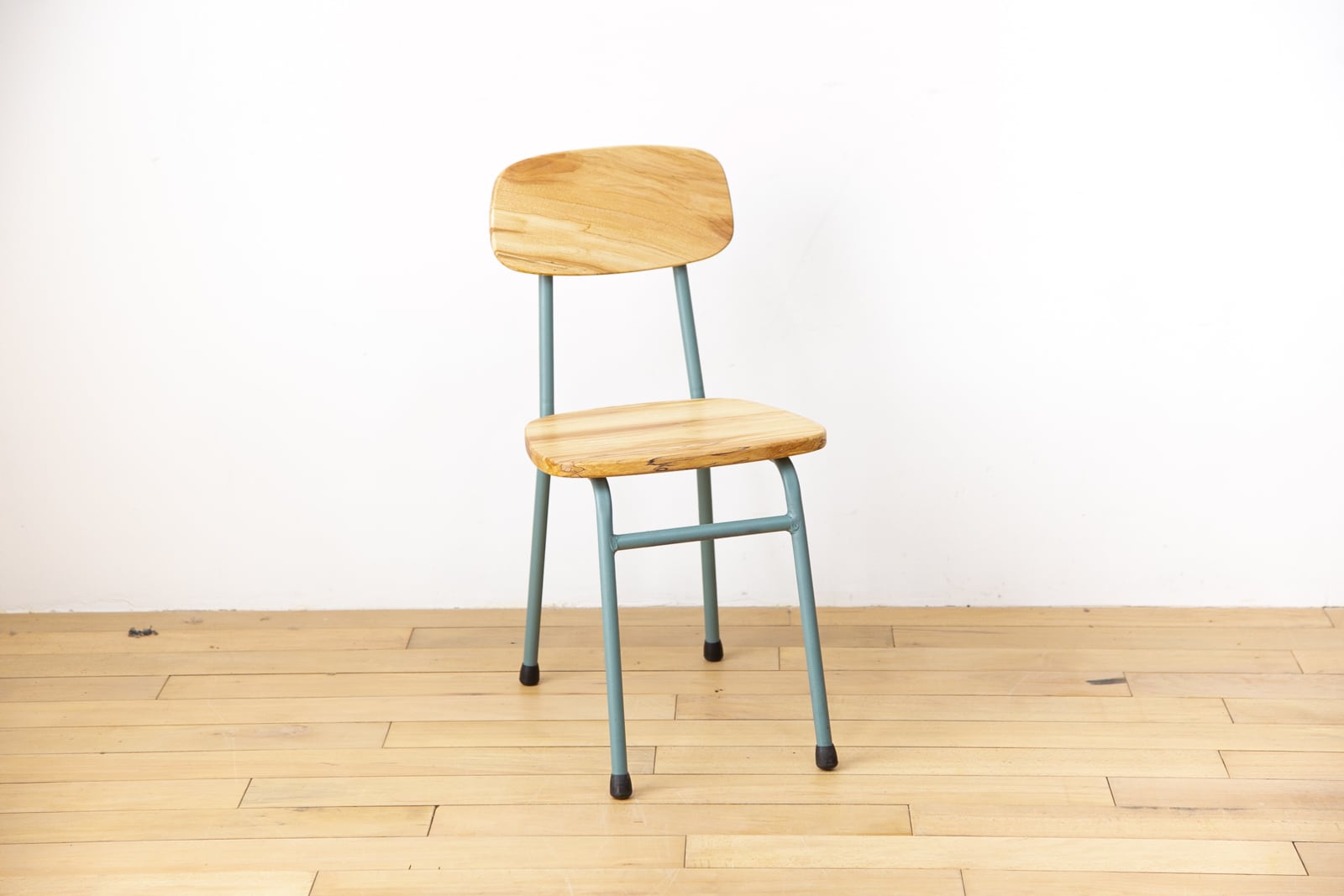 食堂やキッチンなどで使われていた鉄脚の古い椅子をレスキューし、カラー塗装を施した一点ものの椅子です。
