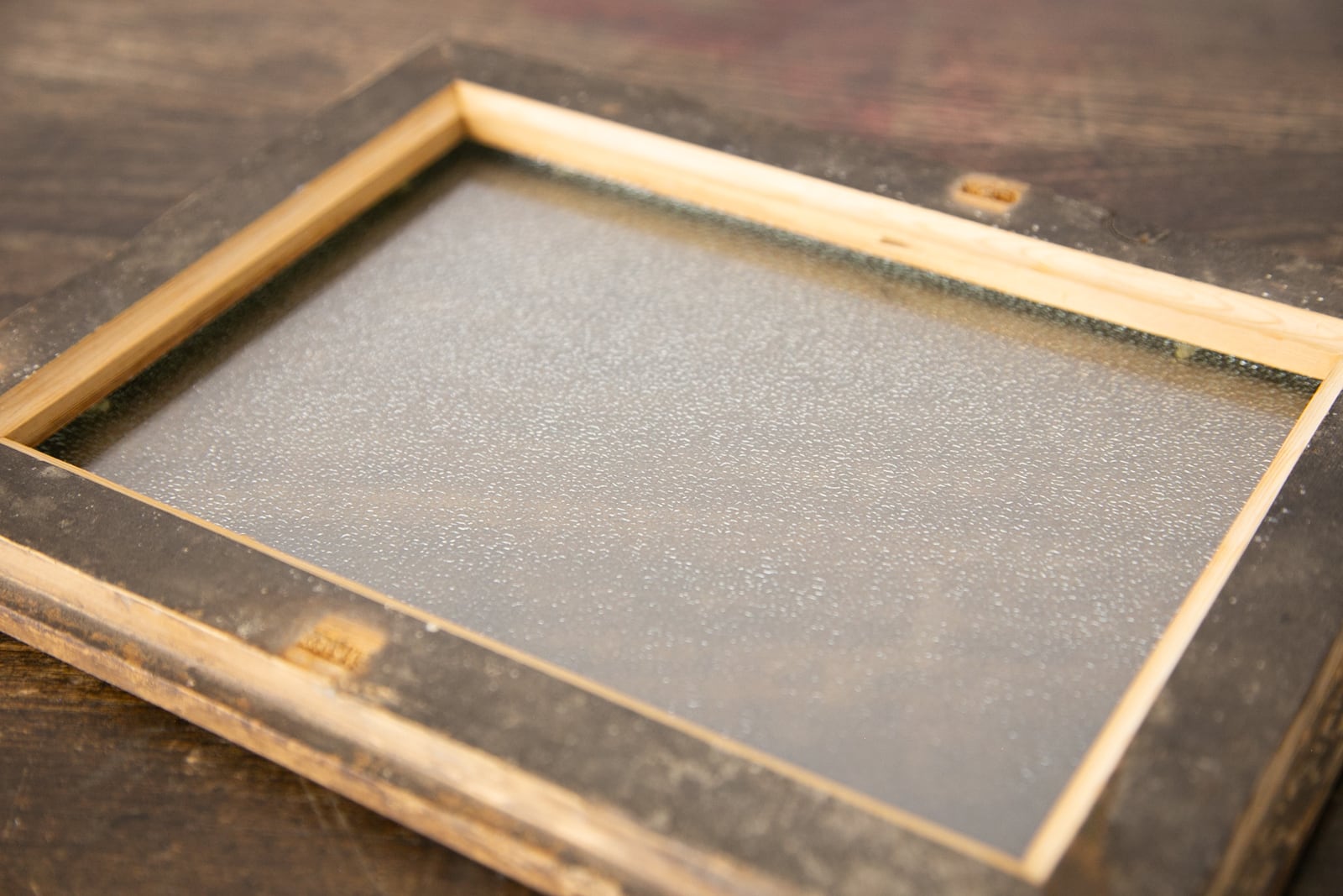 そこに、昔の建具で使われていた古いガラスを組み合わせることで、リビセンらしい額に仕上がりました。