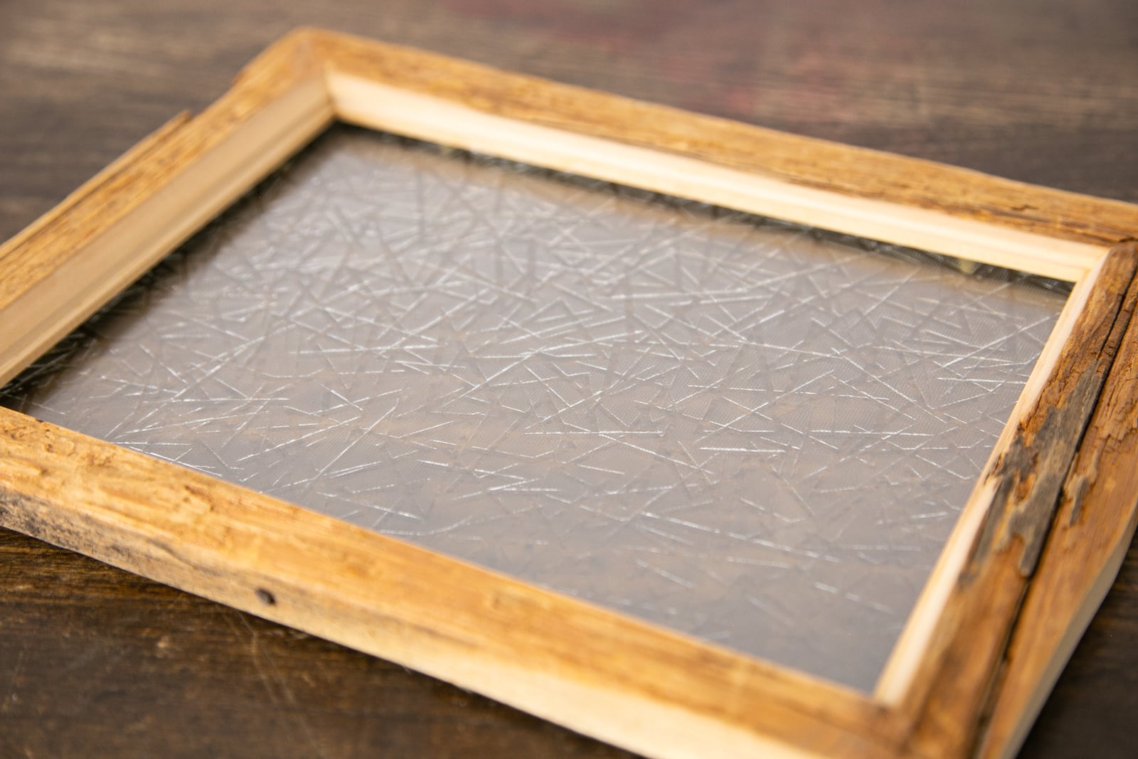 レスキューするガラスには、いまはつくられていない「型板ガラス」と呼ばれる模様が入ったガラスを使っているものもあり、古材との組み合わせで多くのバリエーションのフレームができます!