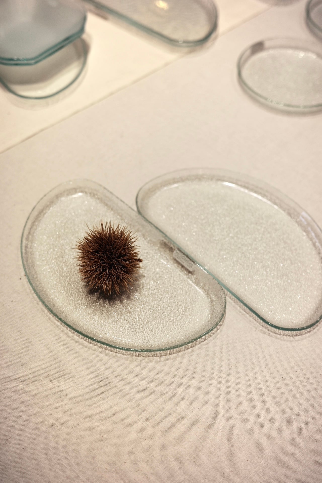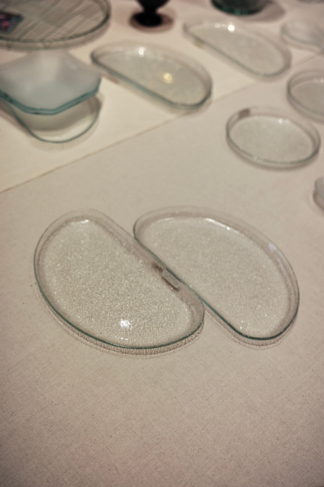 電気窯を使うキルンワークと呼ばれる技法で、板ガラスを自作の石膏型に沿わせて成形し、さまざまな作品を制作