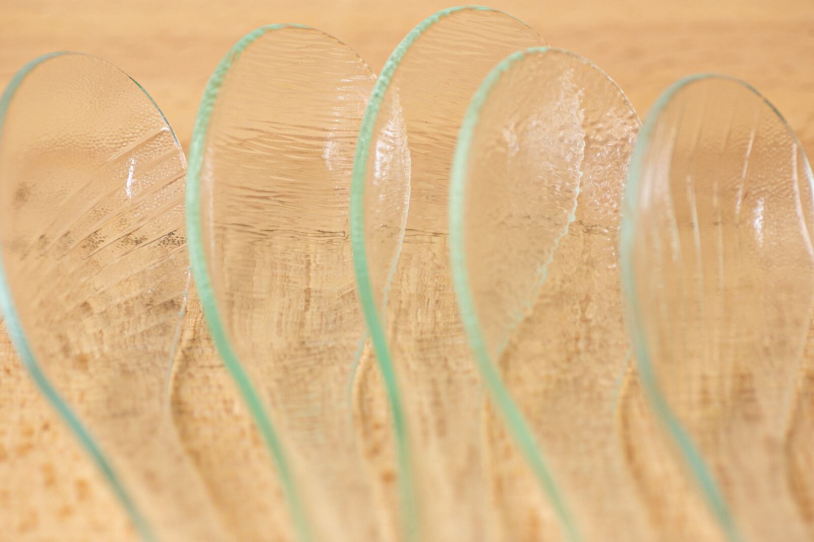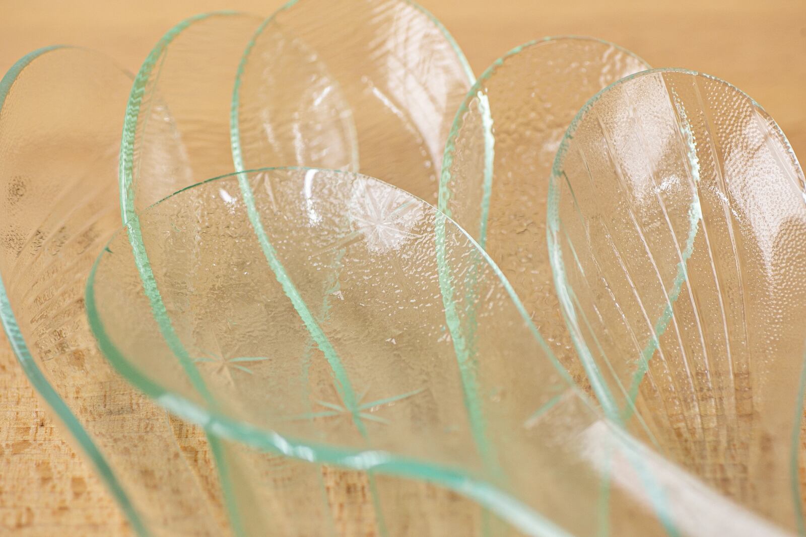 電気窯を使うキルンワークと呼ばれる技法で、板ガラスを自作の石膏型に沿わせて成形し、さまざまな作品を制作